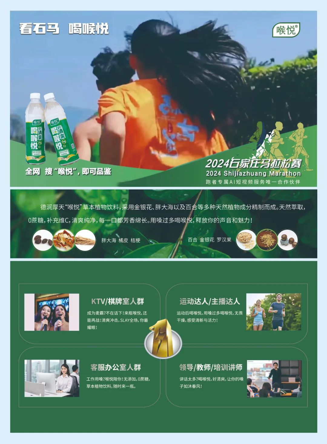 2024石家莊馬拉松賽將于3月31日7時(shí)30分鳴槍開跑,德潤(rùn)厚天集團(tuán)作為2024年石家莊馬拉松跑者專屬AI短視頻服務(wù)的唯一合作伙伴,攜旗下明星產(chǎn)品——喉悅草本植物飲料,為參賽選手們加油助威,為這場(chǎng)體育盛宴注入新的活力與健康氣息,為參賽跑者帶來(lái)全新的賽事體驗(yàn),用科技記錄每一位跑者的精彩瞬間。