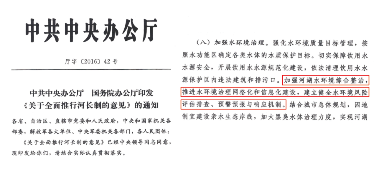 河長制六大任務中提出:加強河庫水環境綜合整治,推進水環境治理網格化和信息化建設,建立健全水環境風險評估排查、預警預報與響應機制。