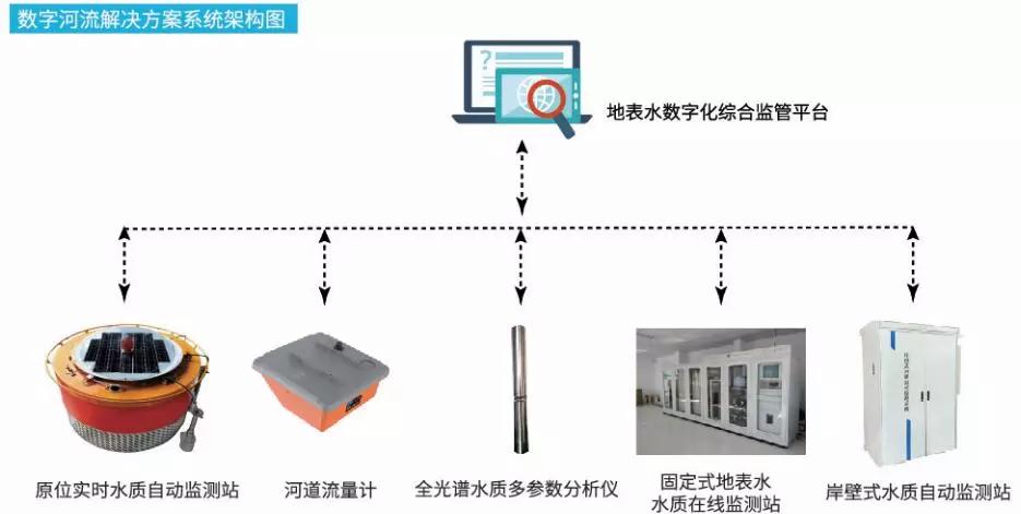 數字河流解決方案由地表水數字化綜合監管平臺、原位實時水質自動監測站、河道流量計、全光譜水質多參數分析儀、固定式地表水水質在線監測站、岸壁式水質自動監測站構成。